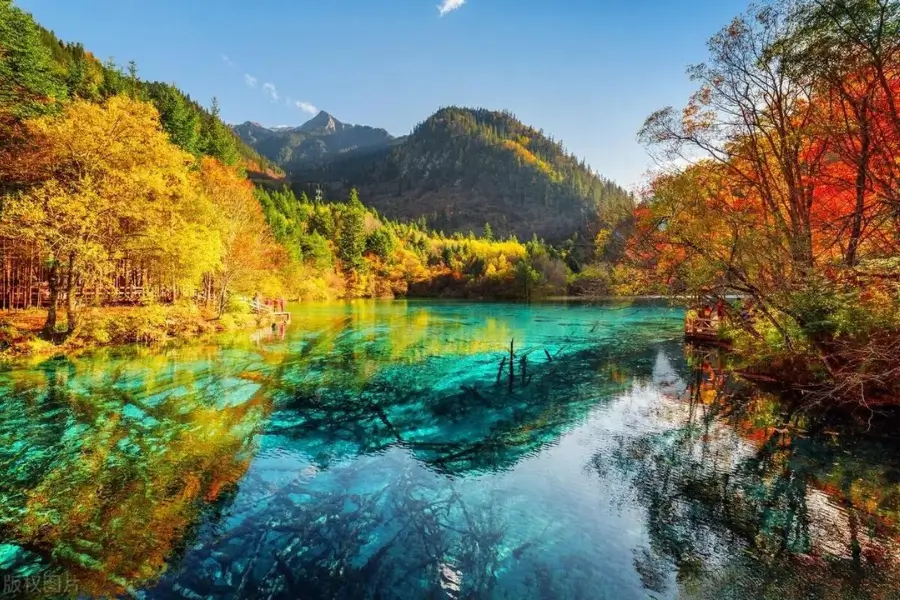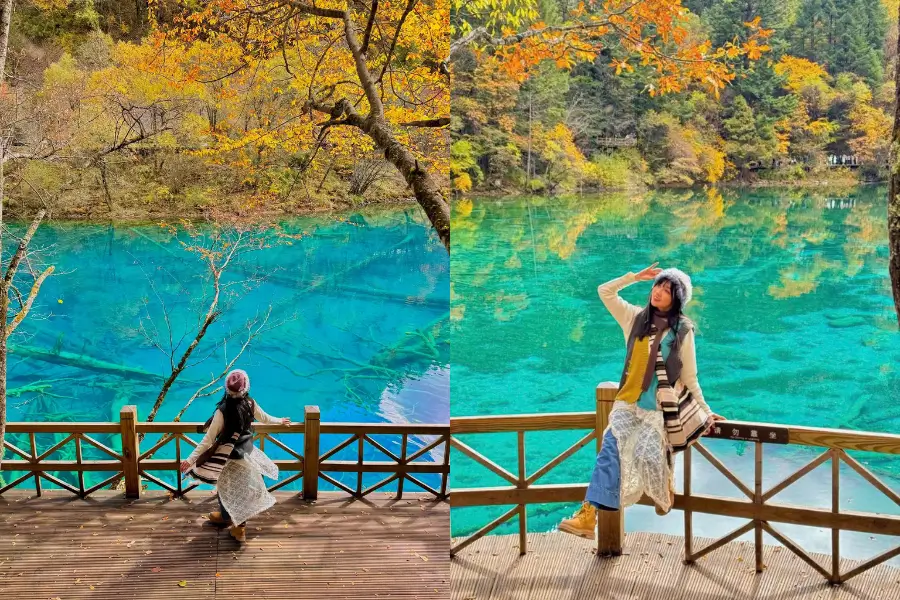 Hồ Ngũ Sắc (Five-Color Pond): Được xem là “viên ngọc” của Cửu Trại Câu, Hồ Ngũ Sắc là một trong những hồ nước đẹp nhất thế giới, với mặt nước trong veo, chuyển màu từ xanh lam, xanh ngọc, đến xanh turquoise. Vào mùa thu, hồ được bao quanh bởi rừng phong đỏ rực và bạch dương vàng óng, tạo nên một khung cảnh như trong tranh. Ánh nắng chiếu qua mặt nước, phản chiếu sắc lá, khiến Hồ Ngũ Sắc trở thành điểm chụp ảnh lý tưởng. Bạn có thể đứng trên các bục quan sát bằng gỗ để ngắm toàn cảnh hoặc đi bộ dọc bờ hồ để cảm nhận sự tĩnh lặng của thiên nhiên.
