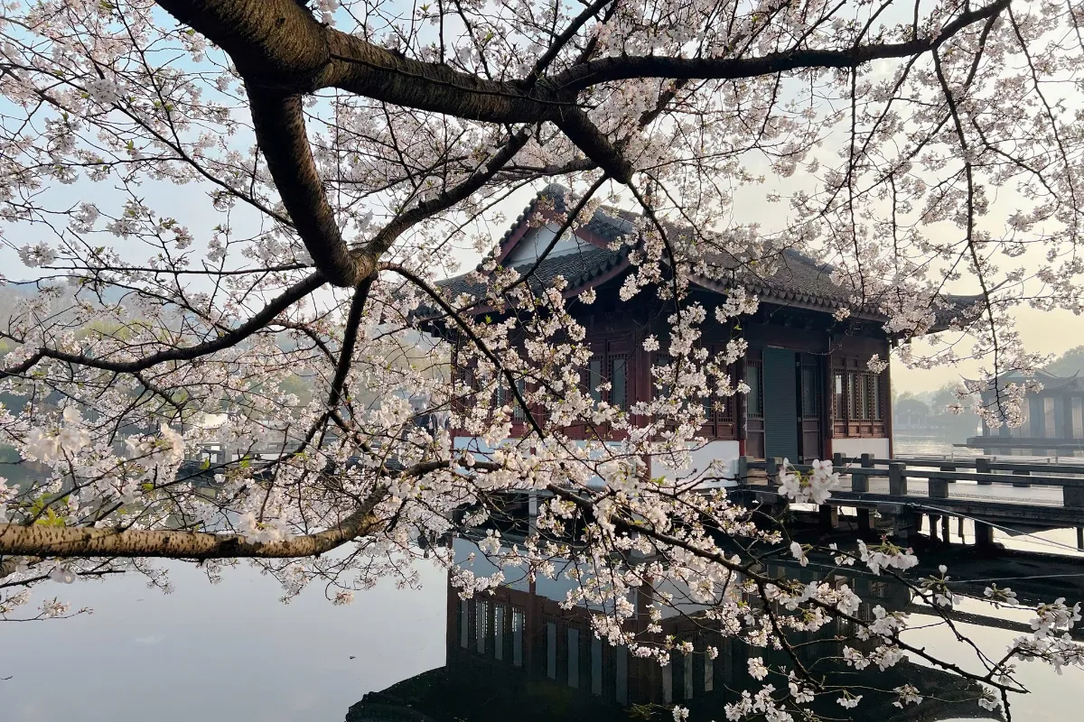 Hoa anh đào Hàng Châu lại mang cho người ta cảm giác nho nhã, tinh tế như thể cảnh sắc núi non hữu tình Giang Nam. Những tán hoa anh đào rủ bóng bên dòng kênh, soi mình xuống mặt nước Tây Hồ. Vẻ đẹp của anh đào Hàng Châu nằm ở sự tĩnh lặng, mong manh như sương sớm. Nếu muốn bắt trọn vẻ đẹp này, bạn hãy dạo bước dọc theo Tô Đê và Bạch Đê, ghé thăm công viên Hoa Cảng Quan Ngư, chiêm ngưỡng đàn cá chép vàng bơi trong hồ hoa anh đào.