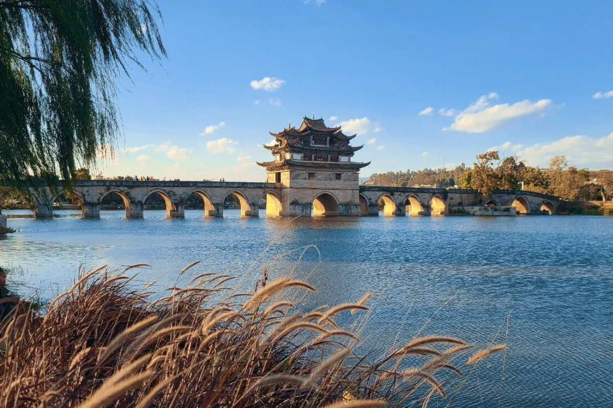 - Cầu Song Long – thường được gọi là “Cầu mười bảy vòm” – trông giống như một đôi rồng uốn khúc. Cầu được xây dựng lần đầu tiên vào thời vua Càn Long. Vào năm 1839 Cầu tiếp tục được xây dựng lần 2. Cầu Song Long có quy mô và gía trị nghệ thuật cao nhất trong số những cây cầu cổ ở Vân Nam.