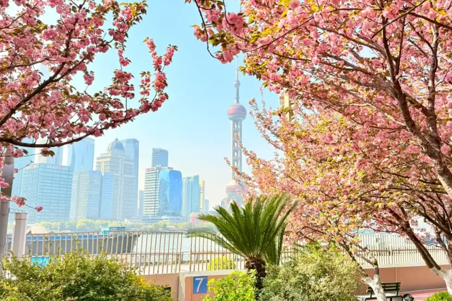 Dọc lối đi bộ ven sông Hoàng Phố tại Bến Thượng Hải, bạn sẽ thấy hàng cây anh đào xen lẫn kiến trúc Âu – Á cổ điển và tầm nhìn skyline thành phố lung linh (đặc biệt buổi tối với đèn neon). Đây là địa điểm đô thị miễn phí, dễ kết hợp ngắm hoa với dạo phố.